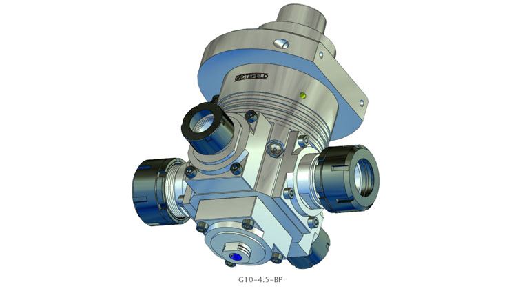 G10-4.5 系列角頭具有帶兩個刀架的連續加工主軸。這意味著兩個刀架之一的主軸旋轉方向與驅動旋轉方向相同,另一個刀架的主軸旋轉方向與驅動方向相反。其他現有加工主軸與連續加工主軸呈90°角布置。